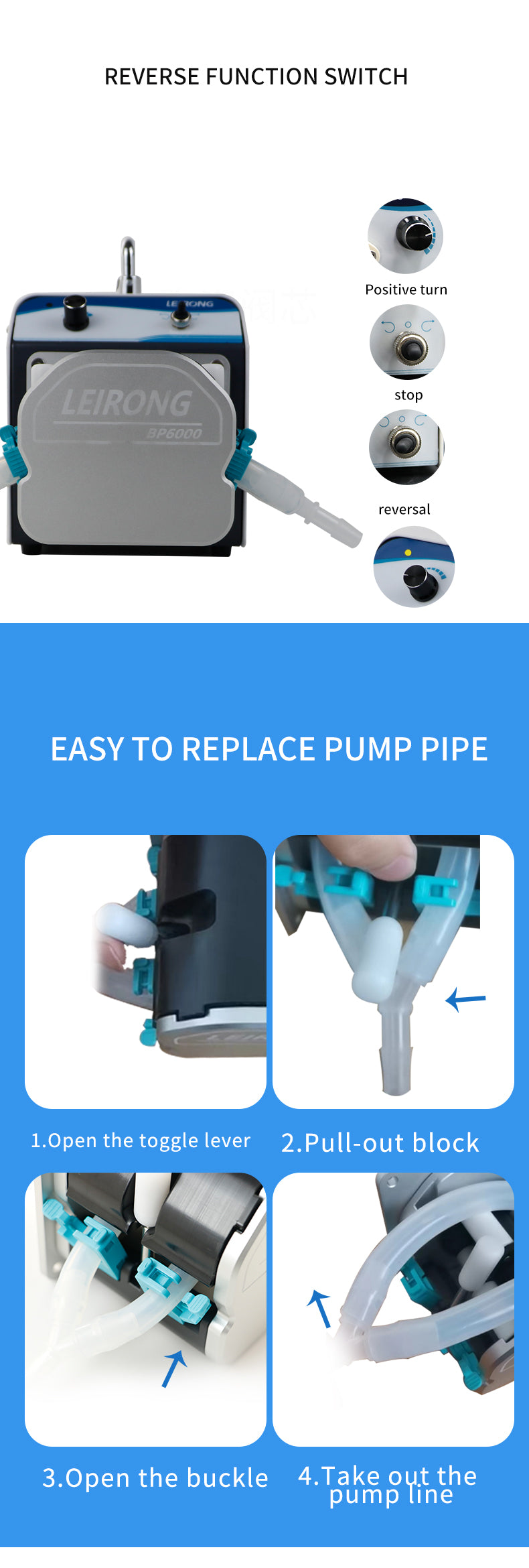 | Other Features | Reversible direction, acid-alkali resistant, metal body, low pulsation, easy tube change |